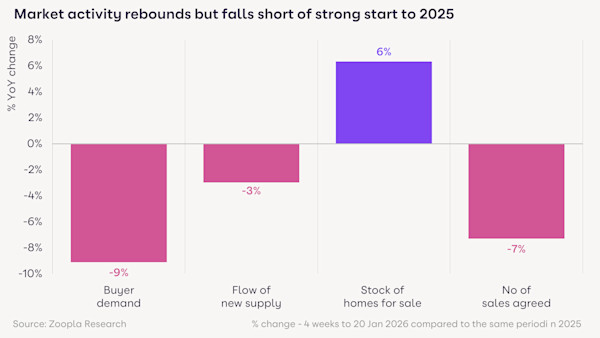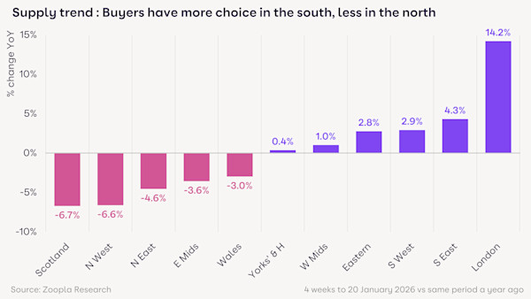Number of homes for sale refers to the 4 weeks to 20 January 2026 vs the same period in 2025.